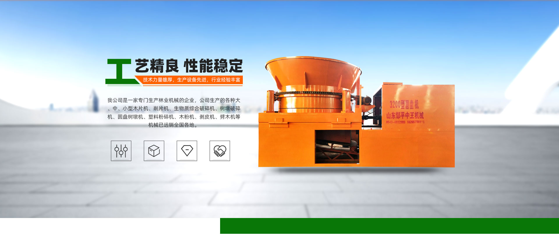 公司技術力量雄厚,生產經驗豐富,是生產木片機、削片機、剝皮機、劈木機等機械的企業,公司以高度的敬業精神、嚴格的科學管理、周到的售后服務宗旨。